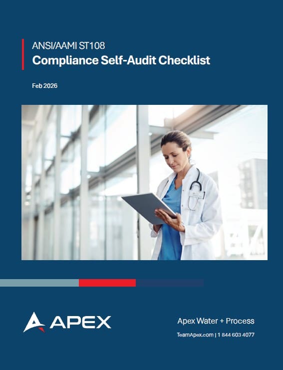 This self-audit checklist has been developed by Apex as a complimentary professional resource to assist Sterile Processing personnel, Water Management Specialists, and facility leadership in assessing current readiness for ANSI/AAMI ST108:2023 compliance. This tool is provided for informational and educational purposes only. It is not intended to constitute legal, regulatory, accreditation, engineering, or clinical advice, nor does it replace a formal compliance review, independent validation, or professional consultation.